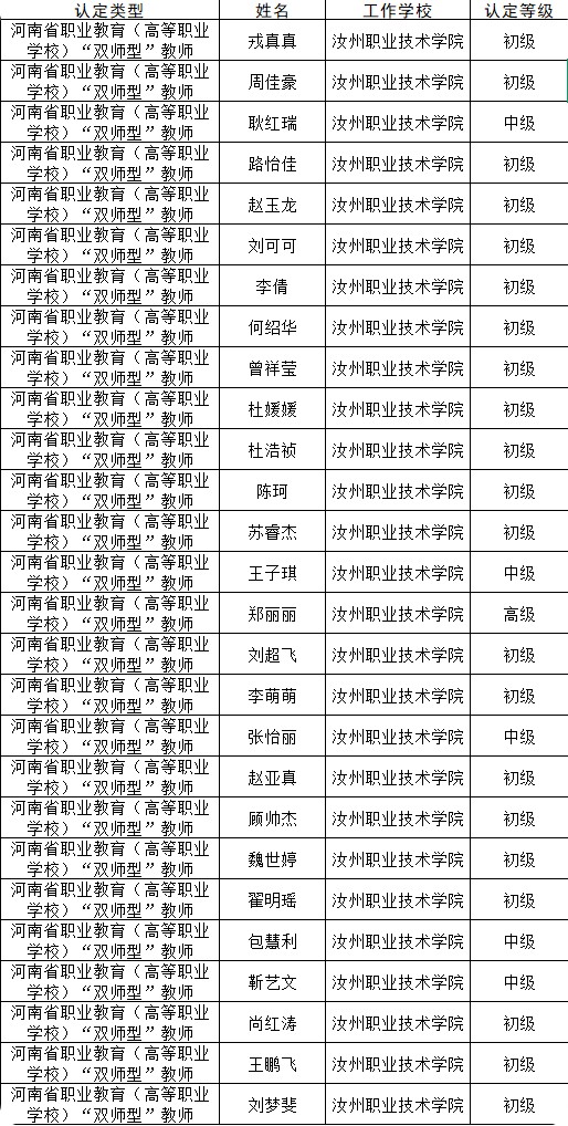 近日,河南省教育厅公布2025年度河南省职业院校“双师型”教师认定通过名单,我院共有27名教师通过认定,其中初级“双师型”教师21位、中级“双师型”教师5位、高级“双师型”教师1位。